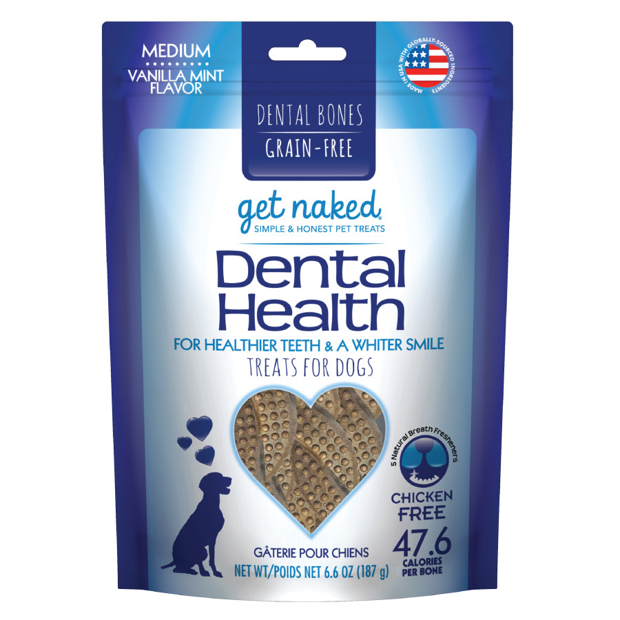 Get Naked® Dental Health Bones are grain-free, chicken-free and all natural. They help dogs have healthier teeth and a whiter smile. Get Naked® Dental Bones help remove plaque and tartar build-up and includes 5 natural breath fresheners: parsley, fennel, dill, green tea extract (decaf) and peppermint. Our delicious bones will satisfy your dog’s desire to chew while promoting healthy teeth and gums.